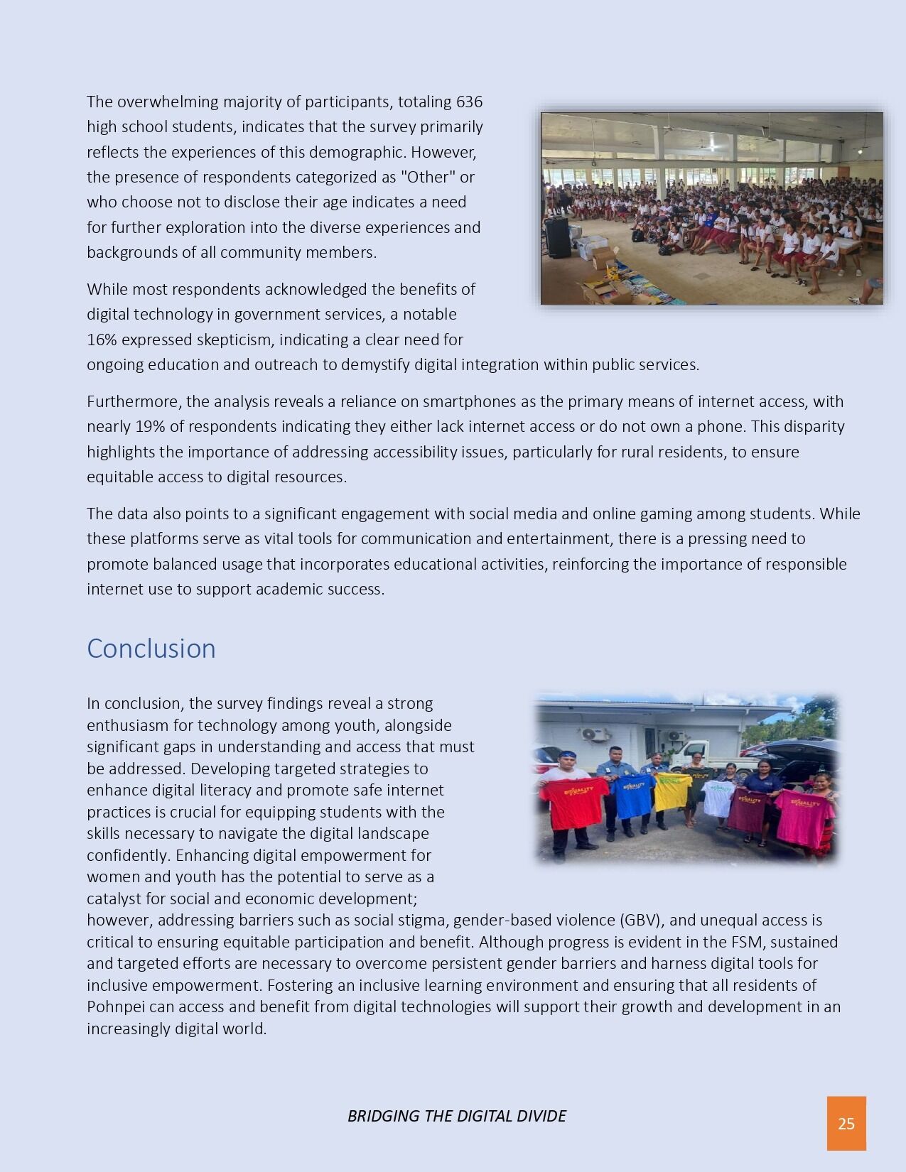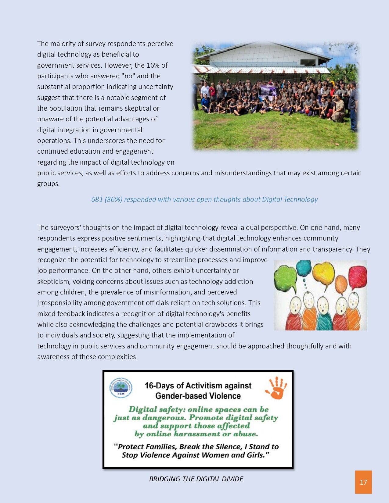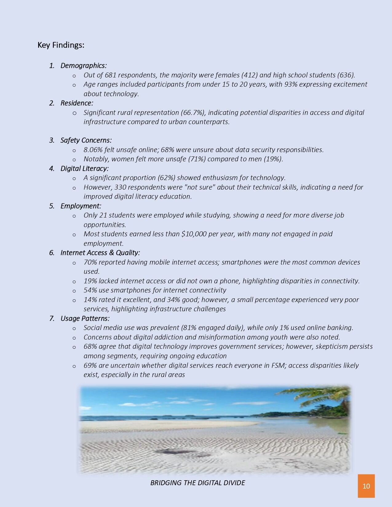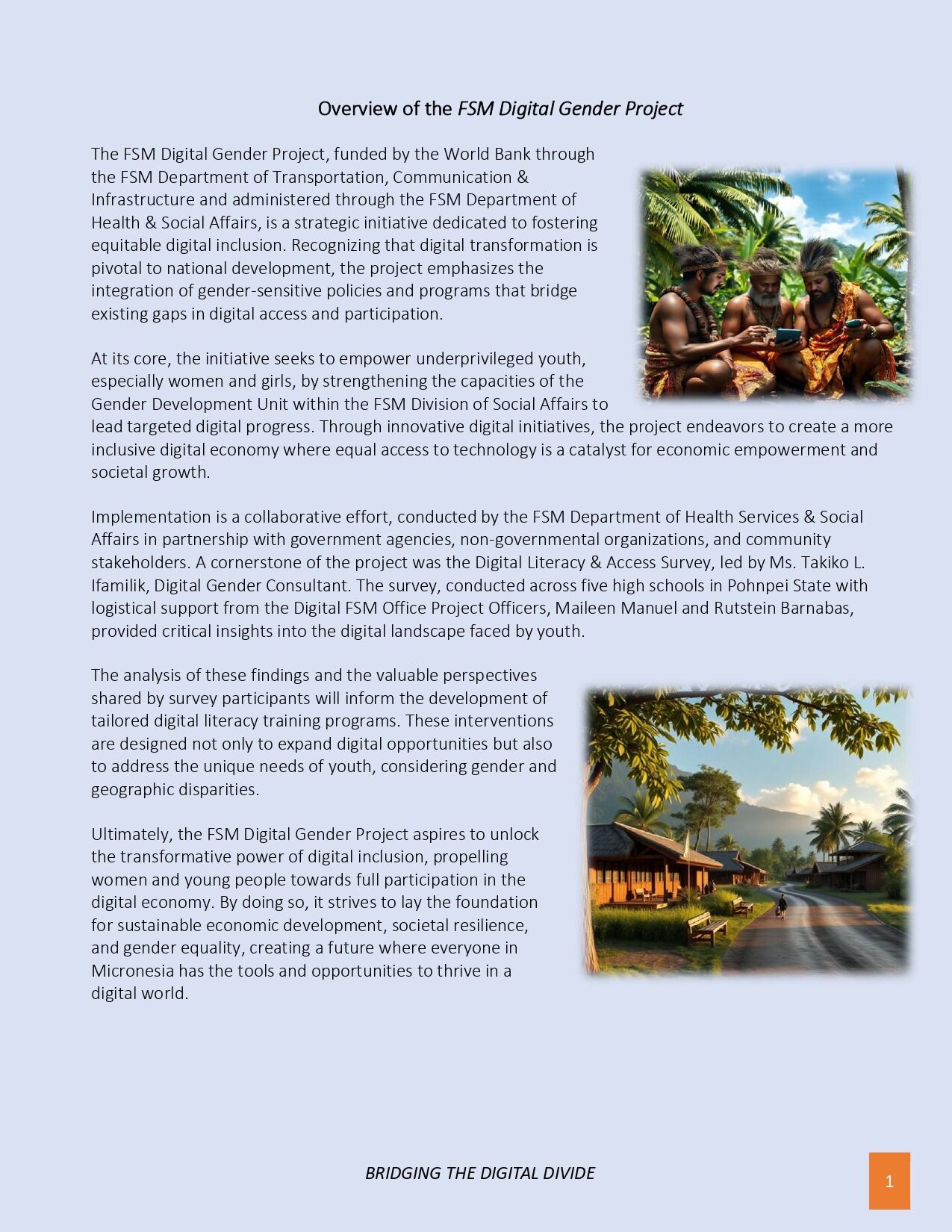 The FSM Department of Health Services & Social Affairs is excited to announce the release of the key findings from the recent Digital Literacy & Access Survey conducted among high school students and staff in Pohnpei, as part of the FSM Digital Gender Project. Funded by the World Bank and led by the FSM Department of Health & Social Affairs, this survey provides critical insights into the digital landscape facing youth today. The results reveal a high level of enthusiasm for technology, with 93% of respondents eager to use digital tools, yet highlight significant challenges such as concerns over online safety, data security, and unequal access, especially in rural areas where 66.7% of participants live. Notably, nearly 19% lack consistent internet connectivity or digital devices, underscoring the urgent need for infrastructure improvements. These insights will inform tailored digital literacy programs, online safety initiatives, and infrastructure development strategies to bridge disparities and promote inclusive digital participation. The findings mark an important step forward in shaping project priorities, ensuring that all youth in FSM can safely and confidently thrive in the digital age.