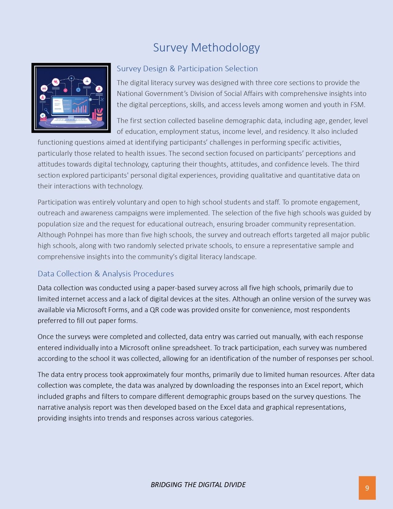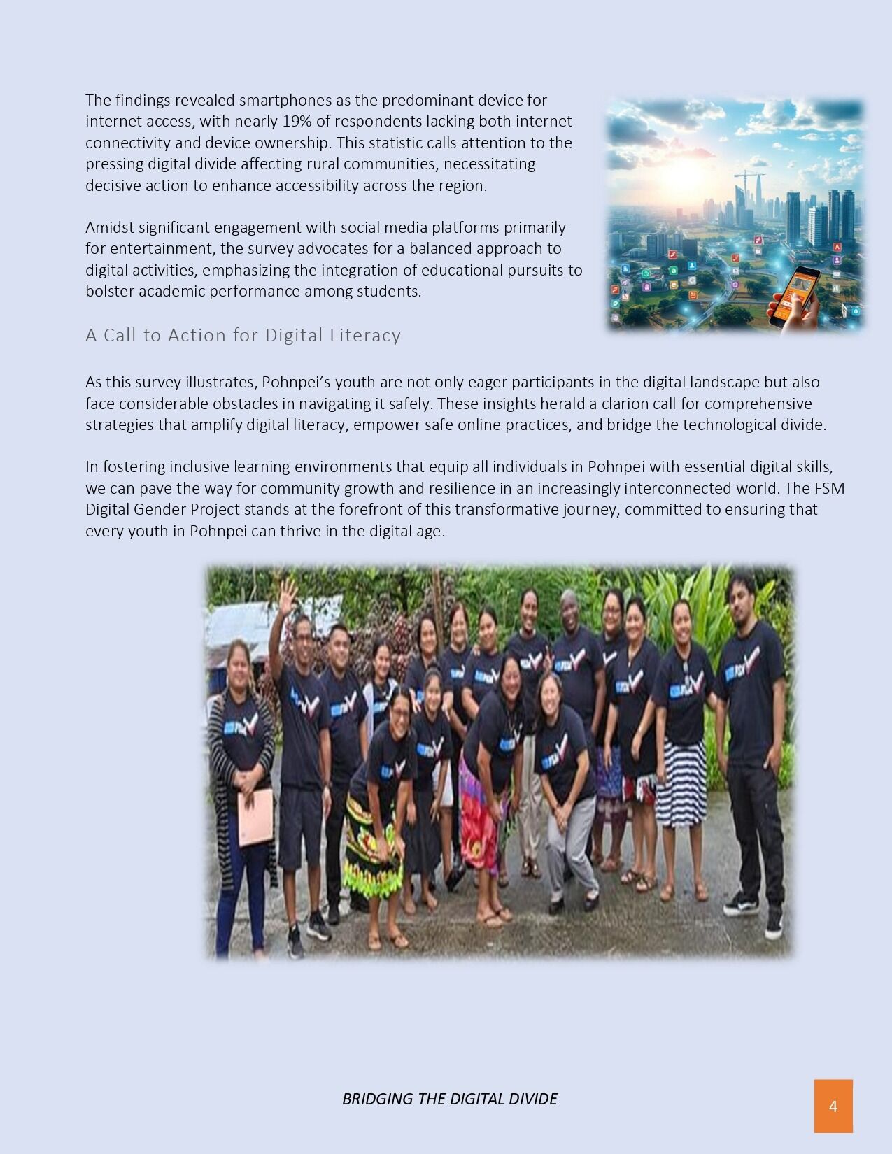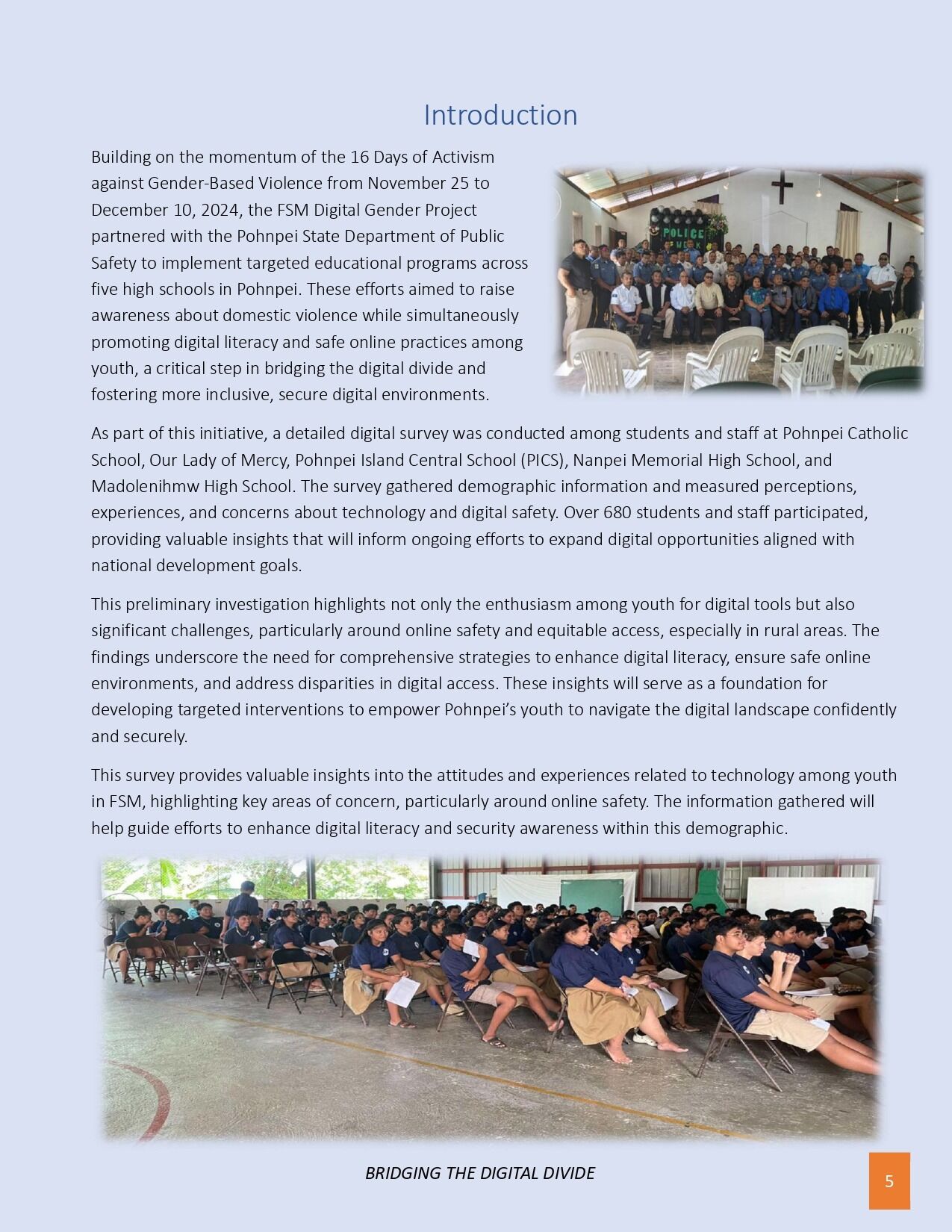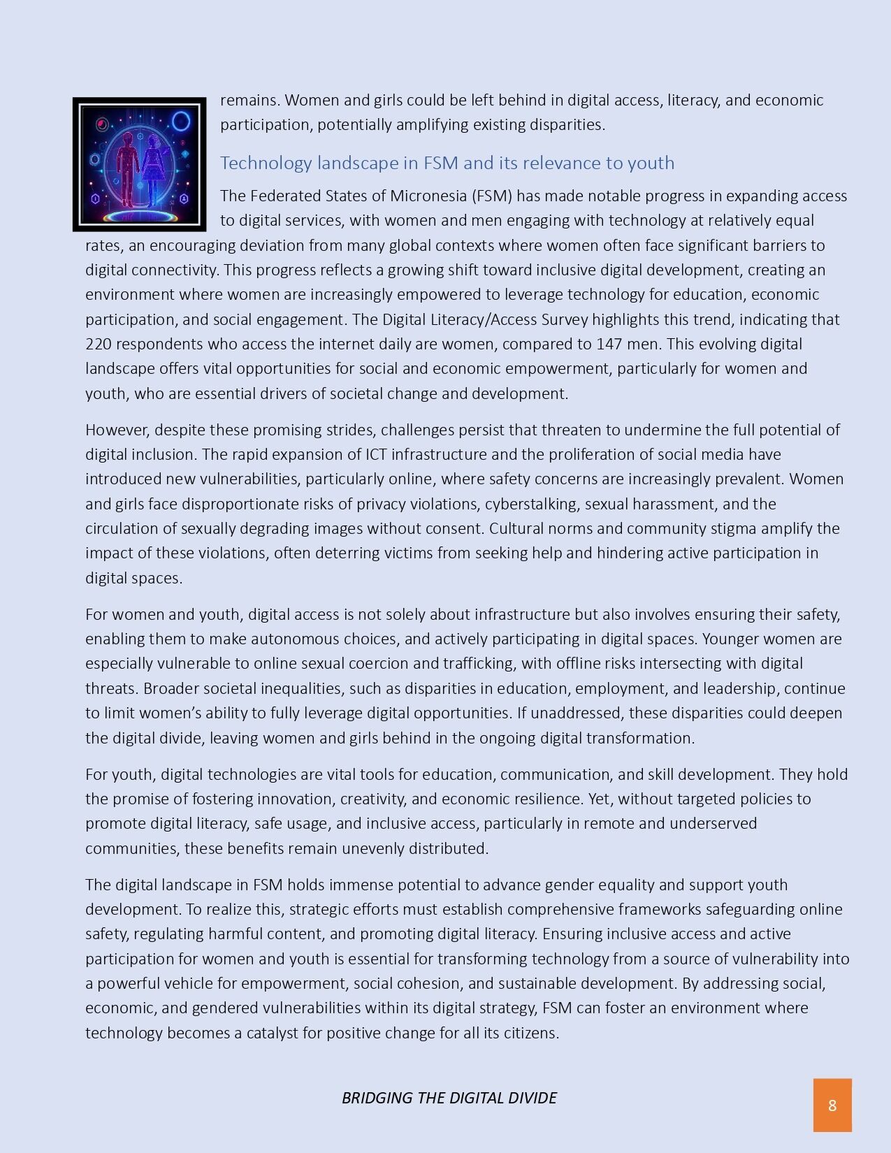 The FSM Department of Health Services & Social Affairs is excited to announce the release of the key findings from the recent Digital Literacy & Access Survey conducted among high school students and staff in Pohnpei, as part of the FSM Digital Gender Project. Funded by the World Bank and led by the FSM Department of Health & Social Affairs, this survey provides critical insights into the digital landscape facing youth today. The results reveal a high level of enthusiasm for technology, with 93% of respondents eager to use digital tools, yet highlight significant challenges such as concerns over online safety, data security, and unequal access, especially in rural areas where 66.7% of participants live. Notably, nearly 19% lack consistent internet connectivity or digital devices, underscoring the urgent need for infrastructure improvements. These insights will inform tailored digital literacy programs, online safety initiatives, and infrastructure development strategies to bridge disparities and promote inclusive digital participation. The findings mark an important step forward in shaping project priorities, ensuring that all youth in FSM can safely and confidently thrive in the digital age.